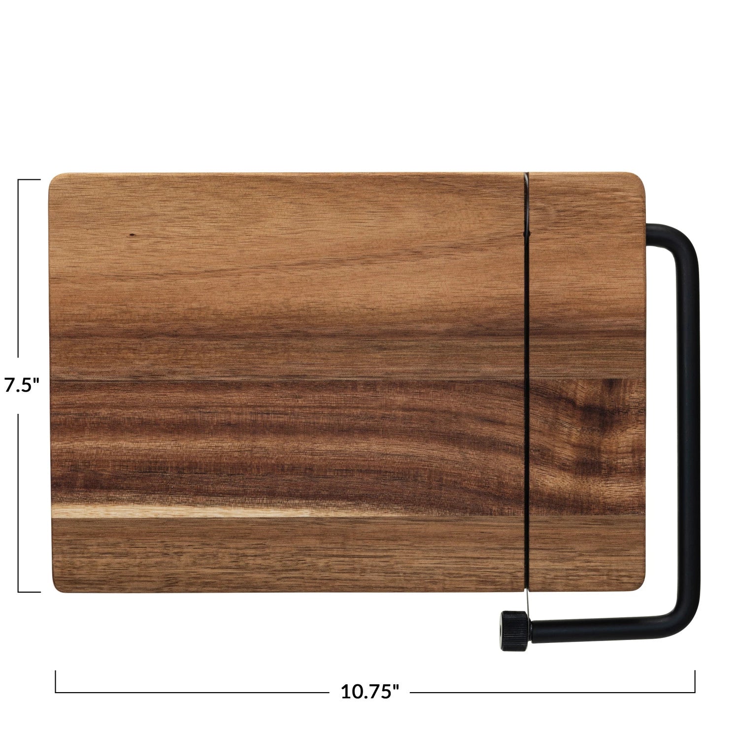This cheese slicer is crafted from acacia wood, a natural material that is durable and beautiful. It has a natural color that varies with each piece, creating a rustic and cozy look. It also has a stainless steel cutting wire that can cut through any type of cheese with precision and smoothness. It has an ergonomic handle that makes it easy to use and control. It also has a hole for hanging that makes it easy to store and display.