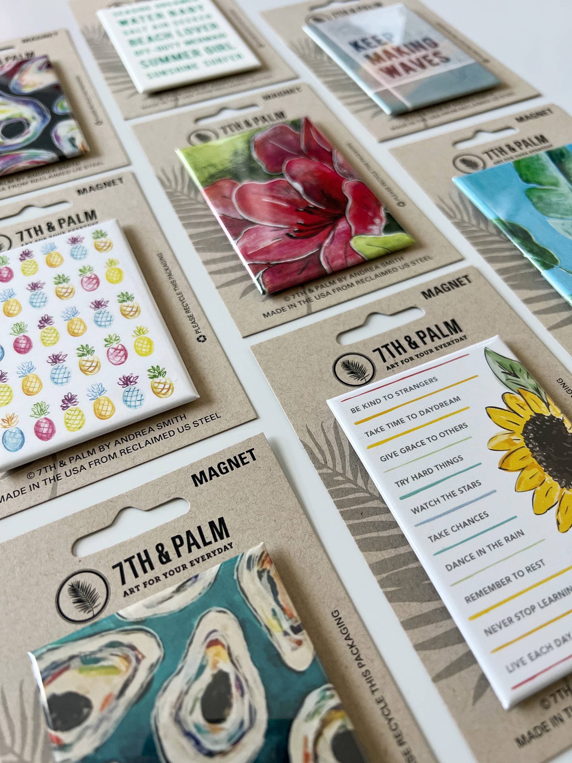 This durable, high-quality fridge magnet is crafted on eco-friendly hemp paper with a sealed soft-touch, matte finish, and illustrated/designed by artist Andrea Smith.