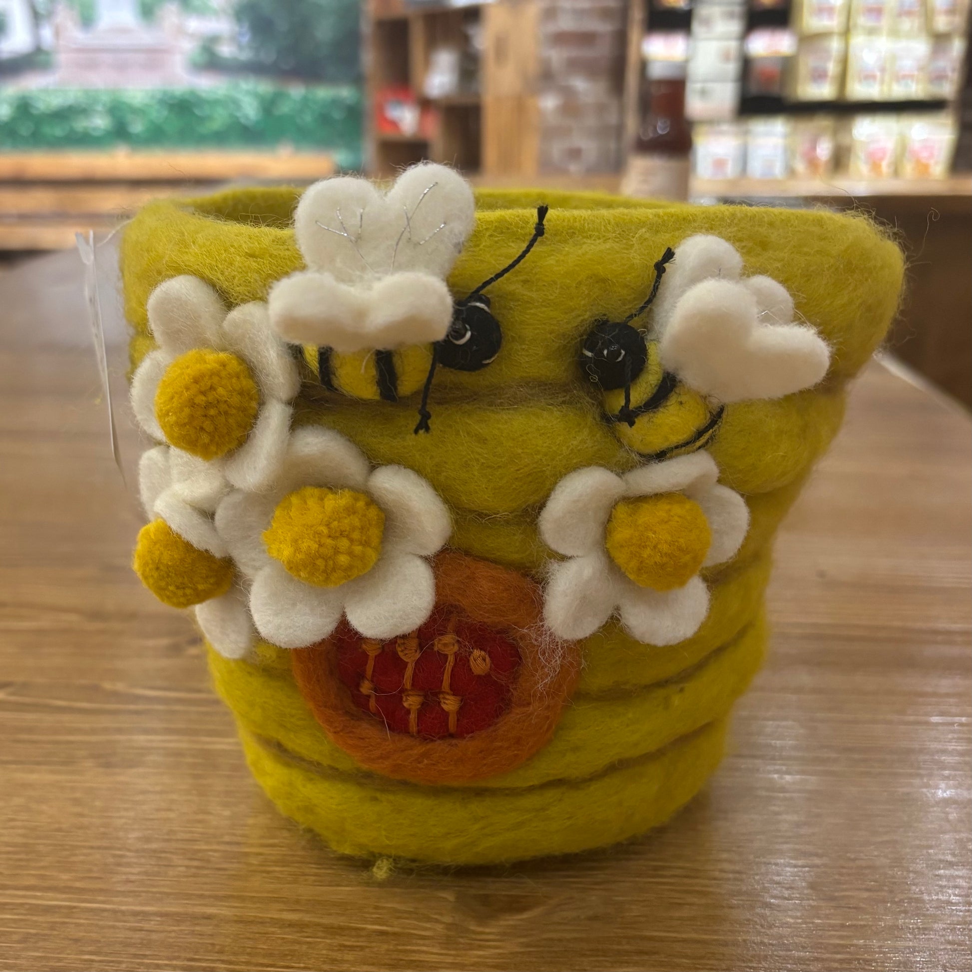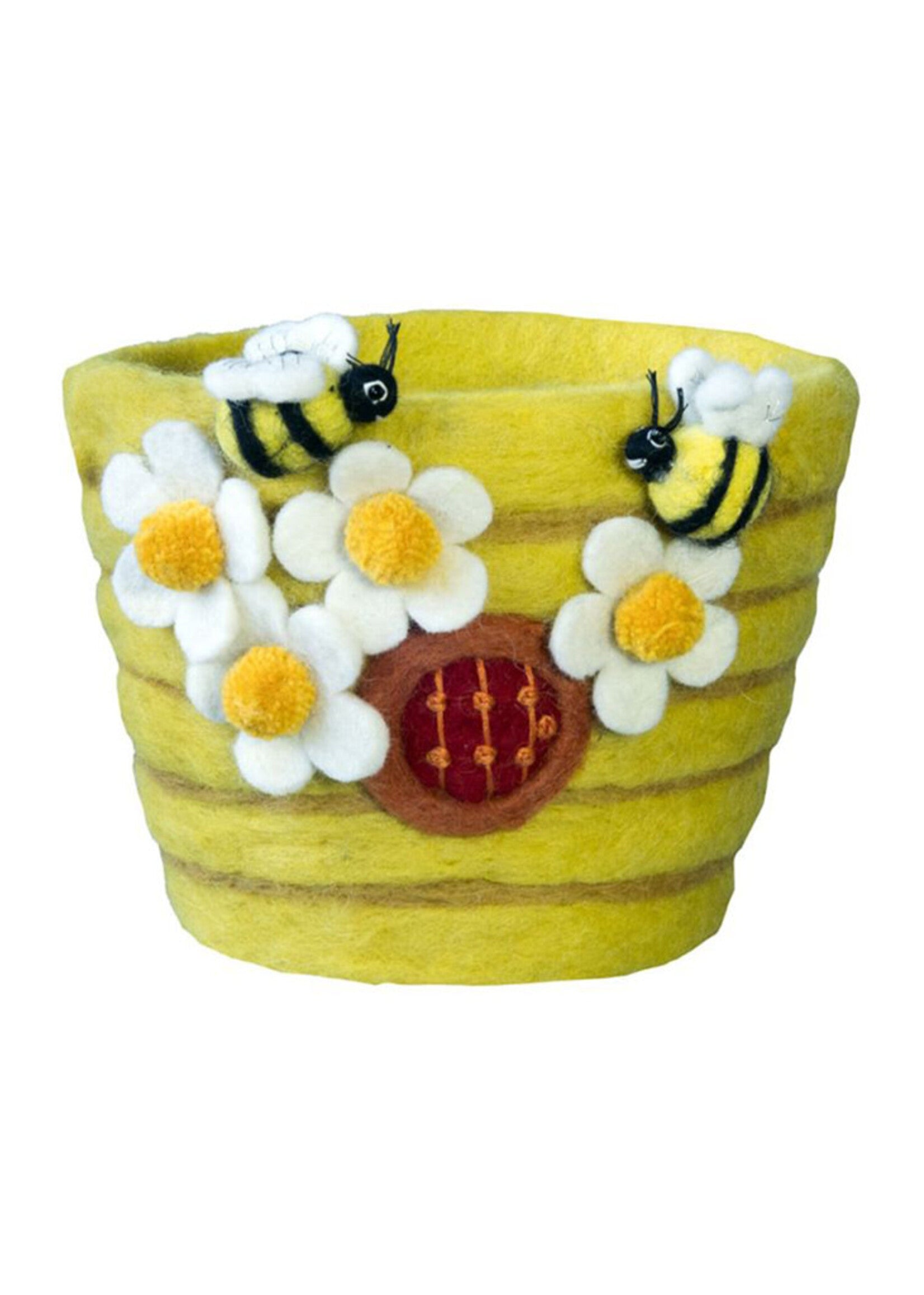 Adorable 6" felted pot with bee and flower appliques. Handmade in Nepal by a fair trade artisan group. Your purchase strengthens artisans, their families, and communities.