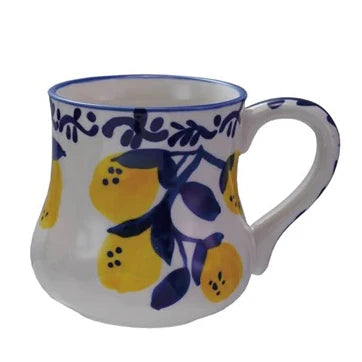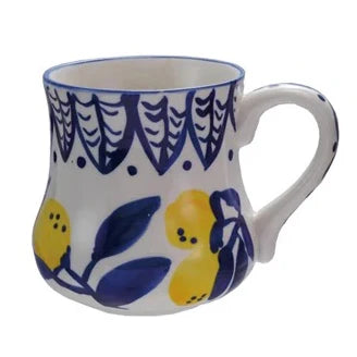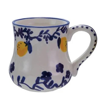 Catalog Name: 3-3/4" Round x 4-1/2"H 16 oz. Hand-Painted Stoneware Mug w/ Lemons, White, Blue & Yellow, 4 Styles to choose from.