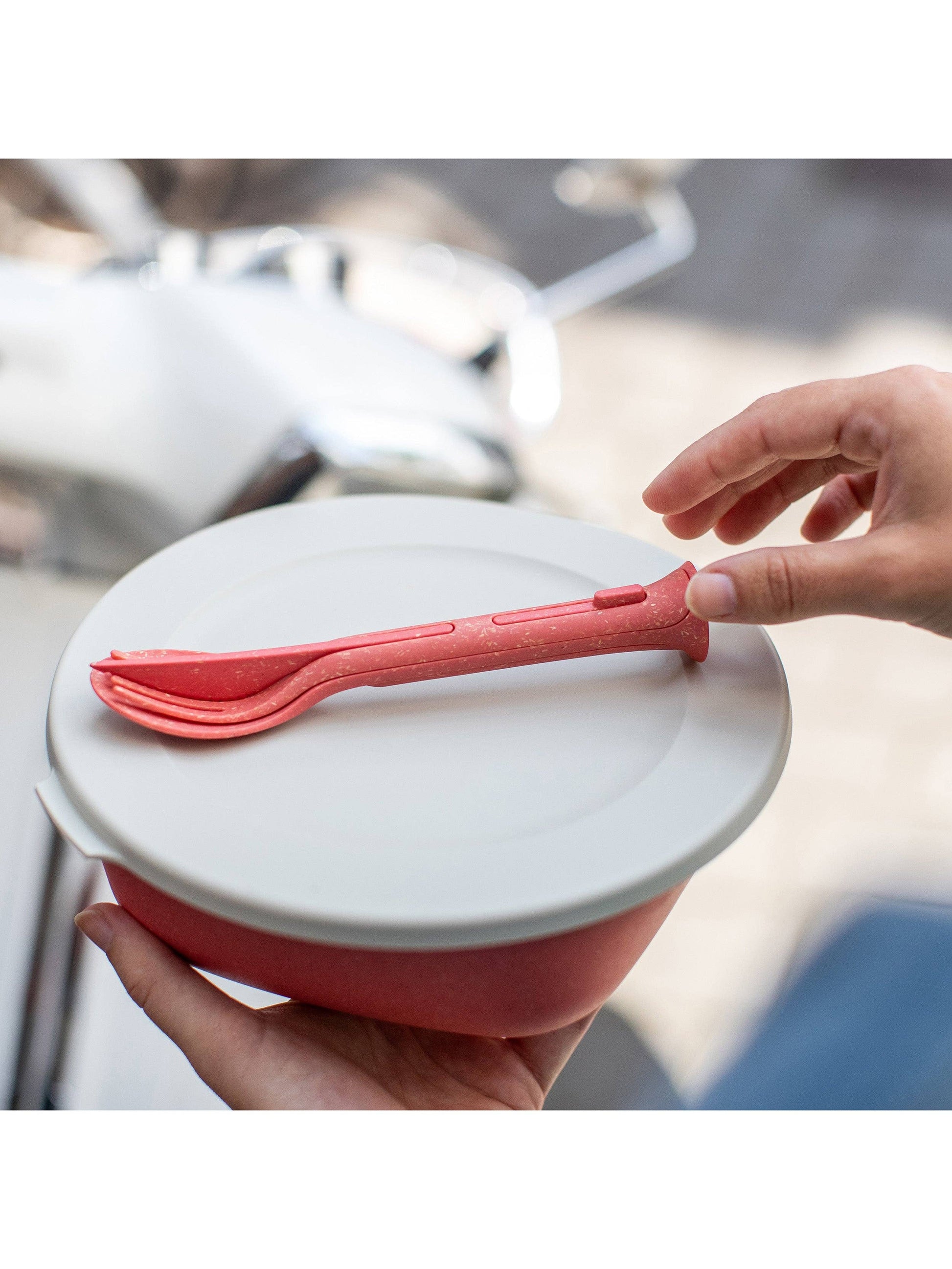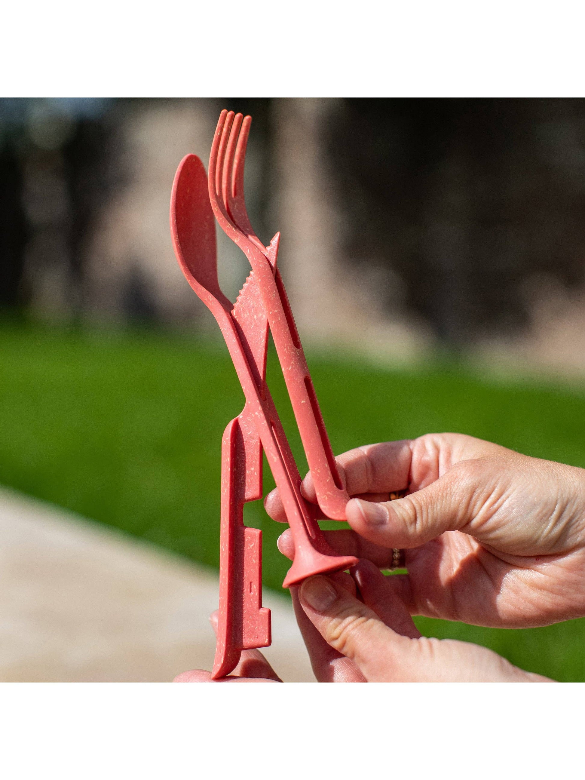 KLIKK POCKET is simply ideal for eating on the go. Knives, forks and spoons can be inserted together compactly so that everything stays together reliably. Simply press the button to open and all parts will easily come off again. All cutlery is extremely robust, and the knife can even handle steaks.