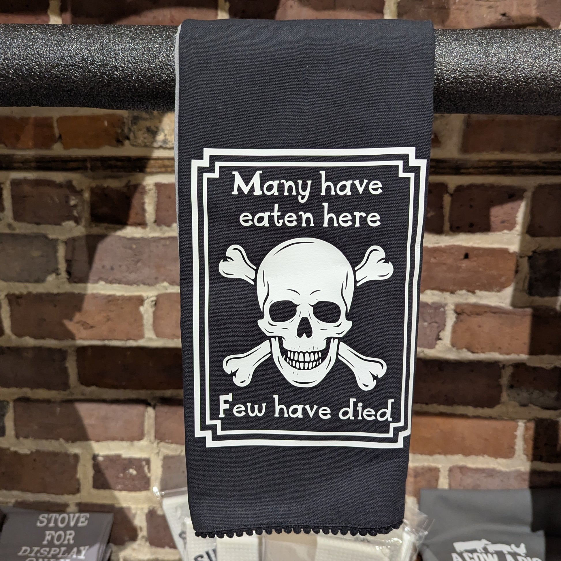 Many have eaten here, few have died funny tea towel with skull and crossbones. Towel measures 18" x 28" in black 100% cotton with an ornamental edge and handy loop for hanging. Created in Savannah, GA.