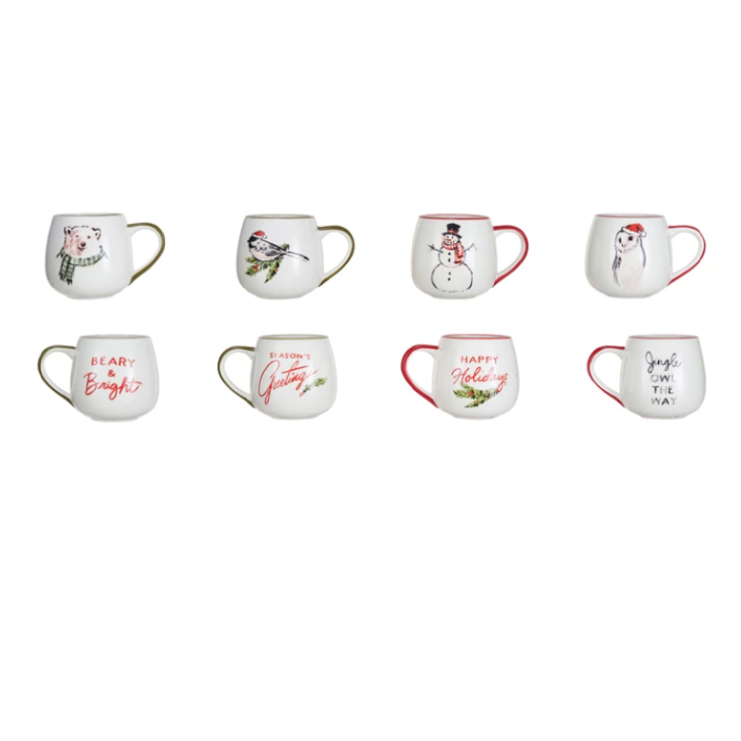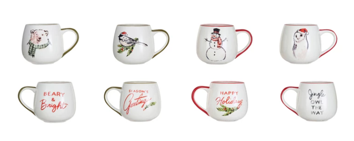Stoneware mugs with holiday sayings and animal prints is a festive and cute way to celebrate the season. The mugs have a round shape and a multicolor design, featuring different holiday sayings and animals. The mugs come in 4 styles, each featuring a different saying and animal. The animals include a polar bear, a penguin, a snowman, and a reindeer. Made of pure stoneware, the mugs measure 4 inches in diameter and 3.75 inches in height, with a capacity of 16 ounces. They can be used for serving hot or cold beverages, or as a decorative piece. They are perfect for seasonal dining and entertaining, or as a thoughtful gift for loved ones. A festive and cute set of 4 stoneware mugs that feature a holiday saying and an animal in multicolor and round shape. A perfect choice for seasonal dining, or a thoughtful gift for loved ones. This set of mugs can be used for serving hot or cold beverages, such as coffee, tea, cocoa, or cider, or as a decorative piece on the table or shelf.