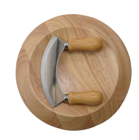 10" Round Rubberwood Herb Cutting Board w/ 5"L Stainless Steel Mezzaluna & Inset, Natural, Set of 2