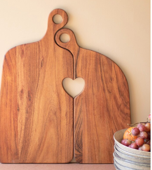 This set of two wooden cutting boards forms a heart when placed together. Give one to your valentine or the newlywed couple. It is made in India.