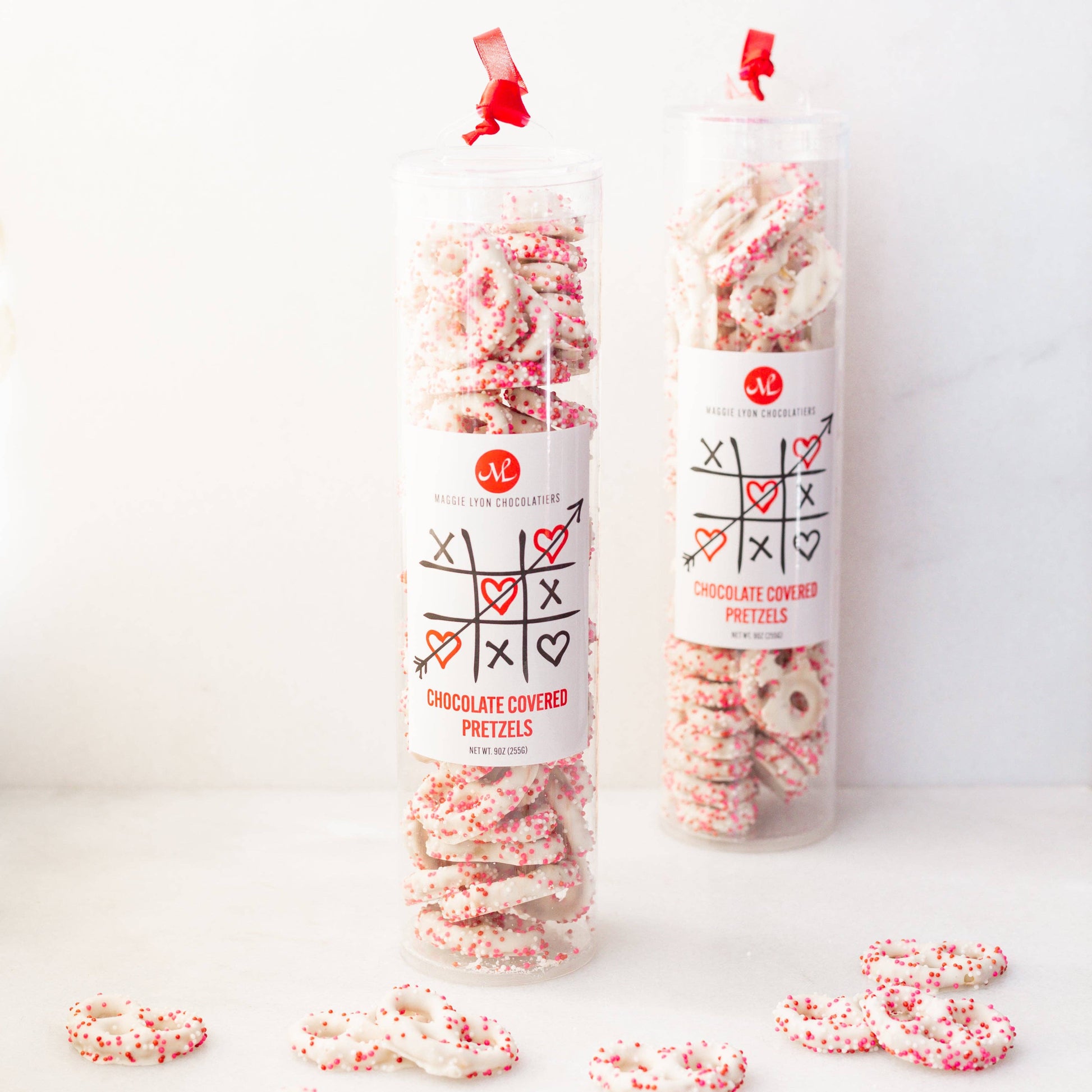 White chocolate-covered mini pretzels with Valentine’s decorations - pink, white, and red nonpareils. Packaged in a clear acetate tube with a front label.